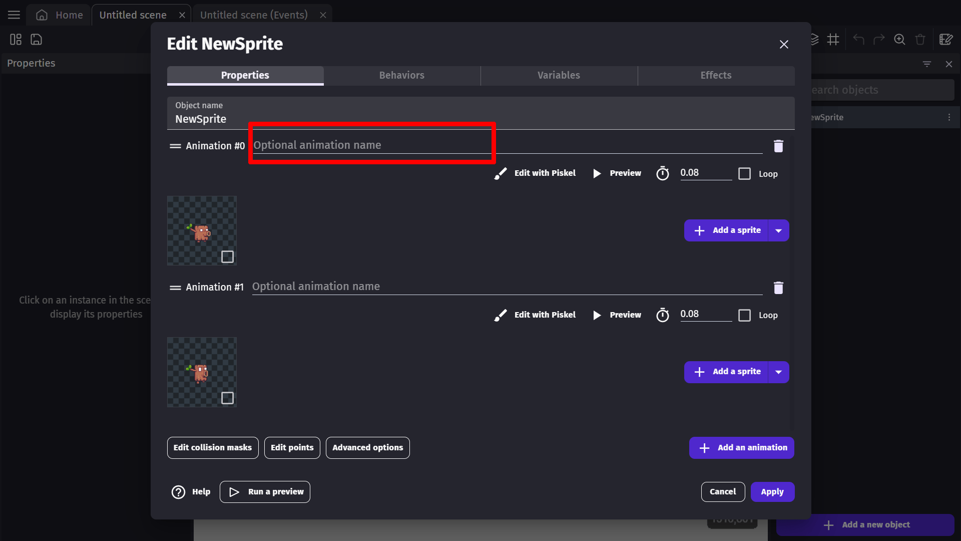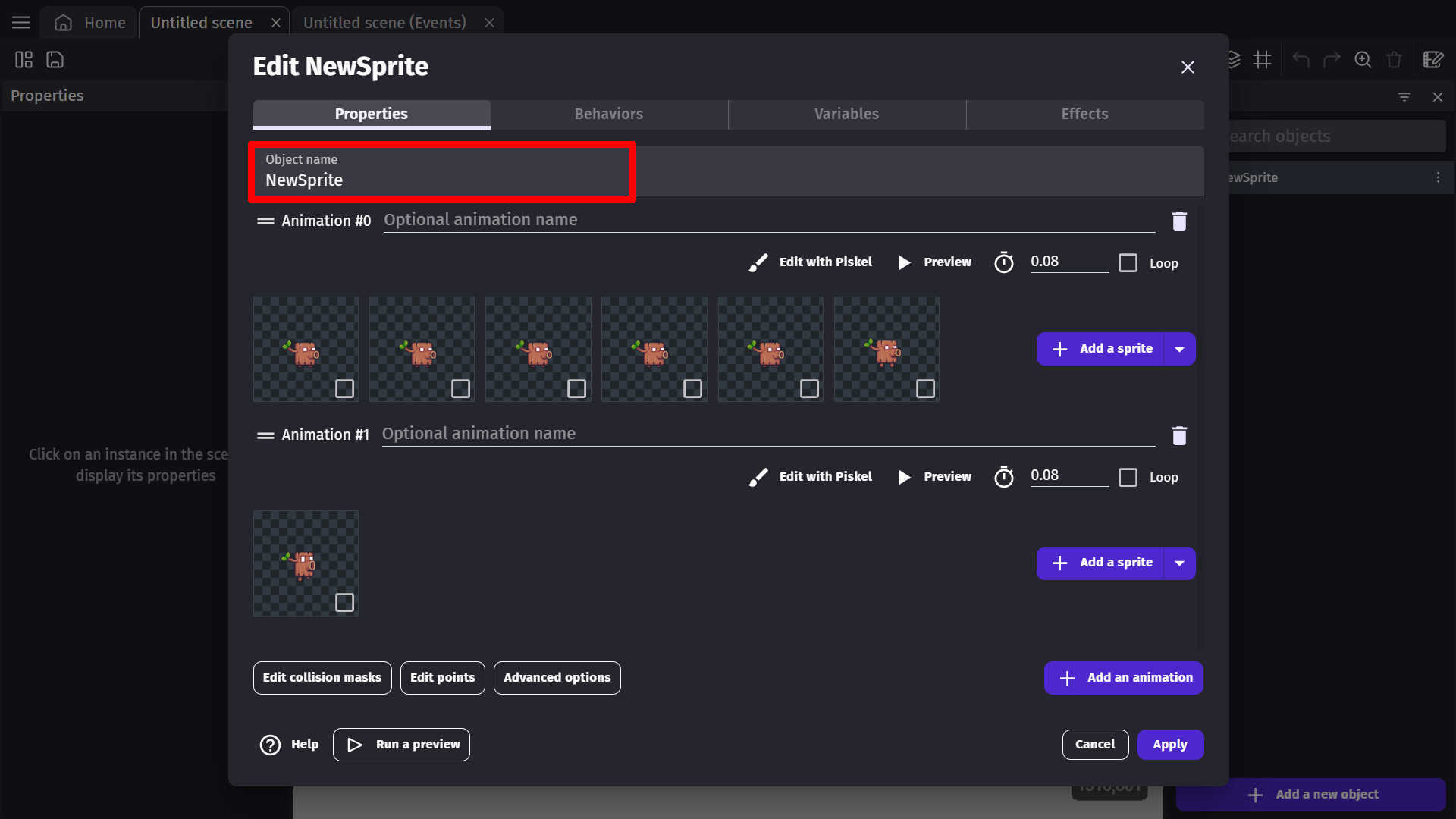 This selection will open up the sprite object properties window. In this window, you will see a few properties of the sprite object.