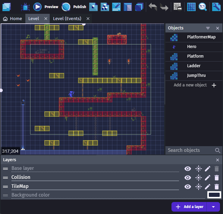 This object is meant for advanced users as it requires Tilemaps to be authored in an external editor: LDtk (Level Designer Toolkit) or Tiled. If you want to build a Tilemap directly inside GDevelop, prefer to use the integrated Tilemap object.